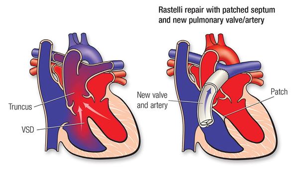 Es necesaria la cirugía para cerrar la comunicación interventricular y separar el flujo sanguíneo hacia el cuerpo del flujo sanguíneo hacia los pulmones. Esto suele hacerse en los primeros años de vida para evitar que la presión arterial alta dañe las arterias pulmonares. Se utiliza un parche para cerrar el defecto ventricular. A continuación se desconectan las arterias pulmonares del gran vaso único (el tronco) y se coloca un tubo (un conducto o túnel) desde el ventrículo derecho hasta las arterias pulmonares. A veces se denomina reparación de Rastelli.