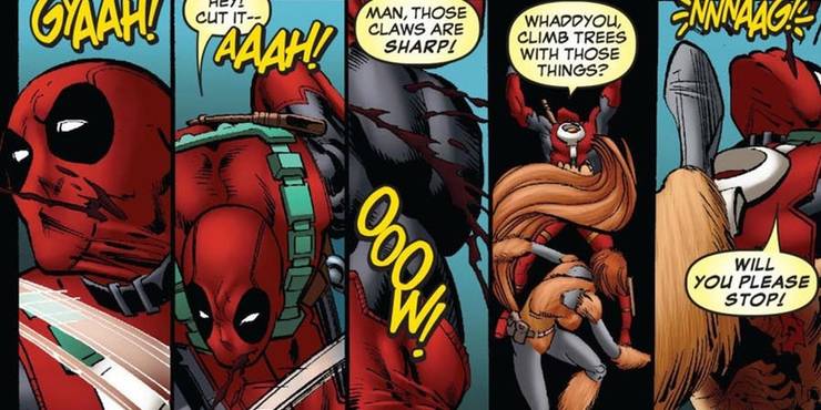 Questo accade in Cable & Deadpool #30 quando il Merc with a Mouth incontra Squirrel Girl in battaglia. Il mercenario mutante con un fattore di guarigione, abilità nelle arti marziali e un sacco di armi non si è dimostrato all’altezza del giovane eroe, che si è fatto strada con gli artigli per fermare Wade sul suo cammino.
