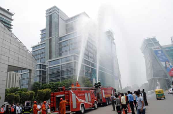 Să luăm exemplul serviciului privat de pompieri, gestionat de compania imobiliară DLF pentru rezidenții proprietăților sale. „Multe dintre clădirile de aici au o înălțime de peste 90 de metri. Brigada de pompieri a guvernului nu are platforme hidraulice care să poată ajunge la această înălțime. Noi avem. De fapt, am fost primii din țară care le-au primit”, spune SK Dheri, șeful departamentului de securitate la incendiu al DLF.